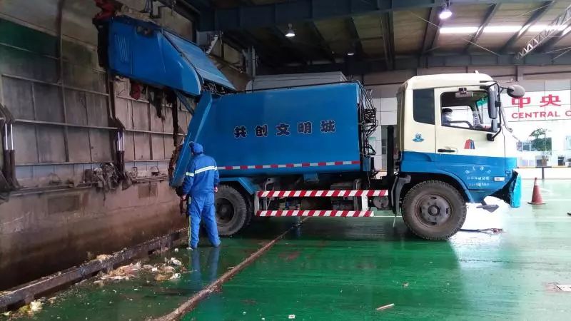 ⑦一路顛簸后,干垃圾車來到生活固廢集裝轉(zhuǎn)運(yùn)徐浦基地,將垃圾倒入“打包槽”
