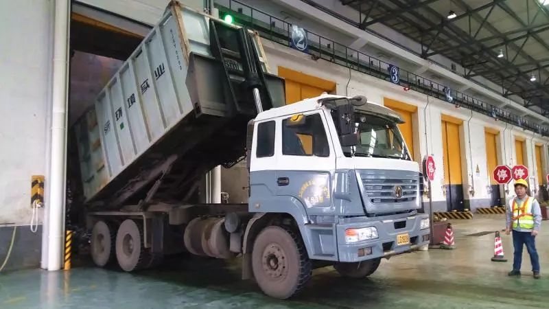?老港固廢處置基地的集運(yùn)車將集裝箱內(nèi)的垃圾傾倒入待焚燒庫區(qū)