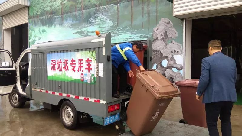 ④清運(yùn)員將干垃圾桶推到清運(yùn)車后的固定架上,隨著固定架的抬升,干垃圾桶內(nèi)的垃圾將倒入車內(nèi)
