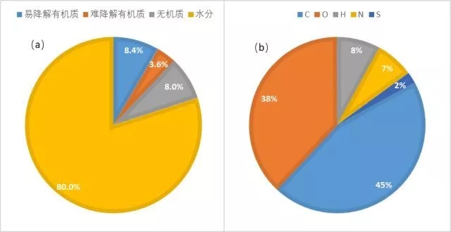 污泥常被認(rèn)為擁有巨大的資源化潛力。然而,無(wú)論從產(chǎn)量還是品質(zhì)上,污泥資源化潛力遠(yuǎn)不如生活垃圾、農(nóng)林廢棄物等大宗廢物。據(jù)國(guó)家統(tǒng)計(jì)局?jǐn)?shù)據(jù),2016年,我國(guó)生活垃圾清運(yùn)量達(dá)2.0億噸,而市政污泥產(chǎn)生量約4000萬(wàn)噸(以80%含水率的脫水污泥計(jì)),扣除水分后,干固體僅800萬(wàn)噸。我國(guó)污泥有機(jī)質(zhì)含量普遍偏低,一般為30~60%,這意味著前述干固體中還有大量缺乏資源化價(jià)值的無(wú)機(jī)質(zhì)。雖然這些無(wú)機(jī)質(zhì)可以用于制建材,但這種方式更適宜稱為廢棄物消納而非資源化利用。有機(jī)質(zhì)中,難以生物降解的木質(zhì)纖維素含量約14~30%,腐殖酸含量約10~15%,它們的存在進(jìn)一步降低了污泥生物轉(zhuǎn)化能源的效率。以污泥有機(jī)質(zhì)含量60%為例,脫水污泥成分可以用圖1(a)概括。從污泥干固體元素組成看,其碳含量相遠(yuǎn)低于生物質(zhì)廢物。根據(jù)對(duì)幾十座南方污水廠污泥性質(zhì)的調(diào)查,其平均元素組成如圖1(b)所示,其中碳元素作為多種資源化處理技術(shù)的利用對(duì)象,其比例僅45%。從污泥有機(jī)物組成看,蛋白質(zhì)是主要成分,但其含量不超過(guò)50%,其次是多糖、腐殖酸、脂類等。
