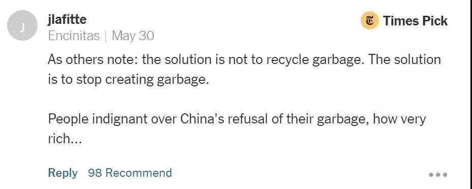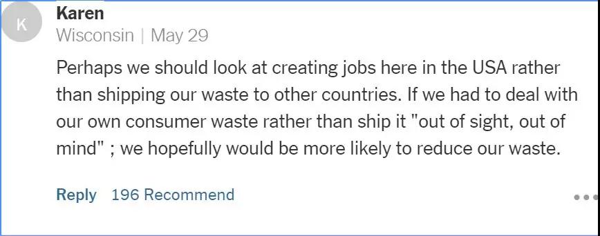 “我們應(yīng)該致力于在美國國內(nèi)創(chuàng)造更多的垃圾處理相關(guān)的就業(yè)崗位,而不是把垃圾轉(zhuǎn)運(yùn)到其他國家。如果我們能意識到自行處理垃圾是件多么困難的事情的話,我們的浪費(fèi)也就自然而然減少了。”