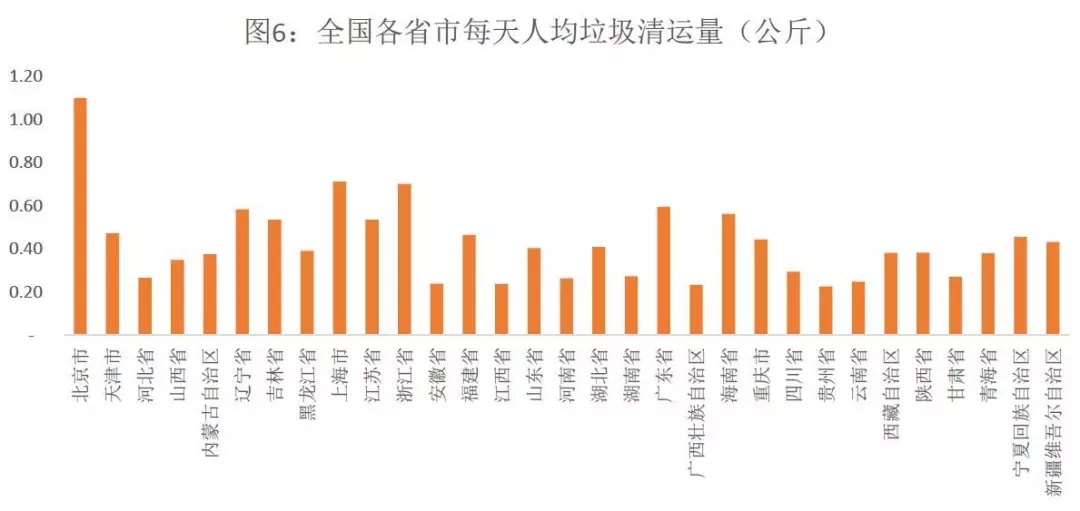 下圖為2016年全國(guó)各大省市垃圾清運(yùn)量的數(shù)據(jù),可以看出北京市以每日人均清運(yùn)1.1公斤垃圾領(lǐng)銜全國(guó)首位。該數(shù)據(jù)并不代表北京市居民一定是產(chǎn)生垃圾最多的,因?yàn)槔暹\(yùn)量與垃圾產(chǎn)生量中間有一定差異,且北京的垃圾清運(yùn)率在全國(guó)應(yīng)該是比較充分的。