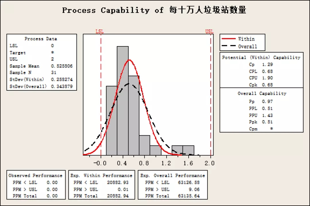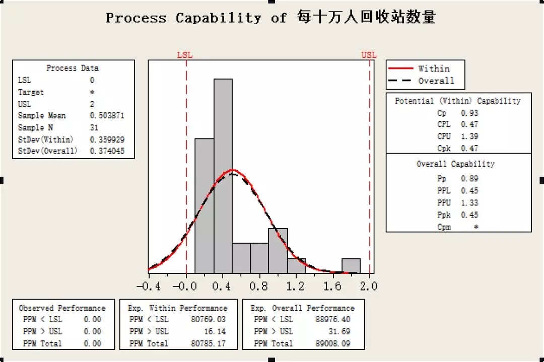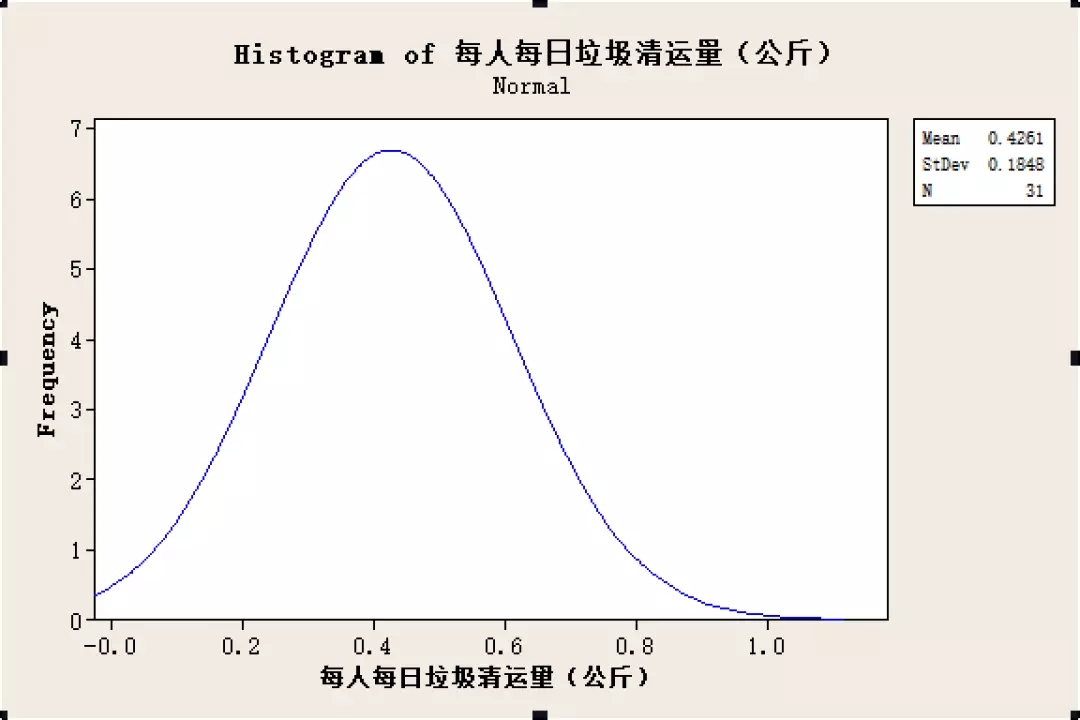根據(jù)對(duì)每日垃圾清運(yùn)量數(shù)據(jù)的直方圖以及正態(tài)分布圖,可以看出,全國(guó)各大省市的每日人均垃圾清運(yùn)量基本符合正態(tài)分布,其中大部分省市的人均每日清運(yùn)量在0.2-0.6公斤之間,平均值為0.42公斤。