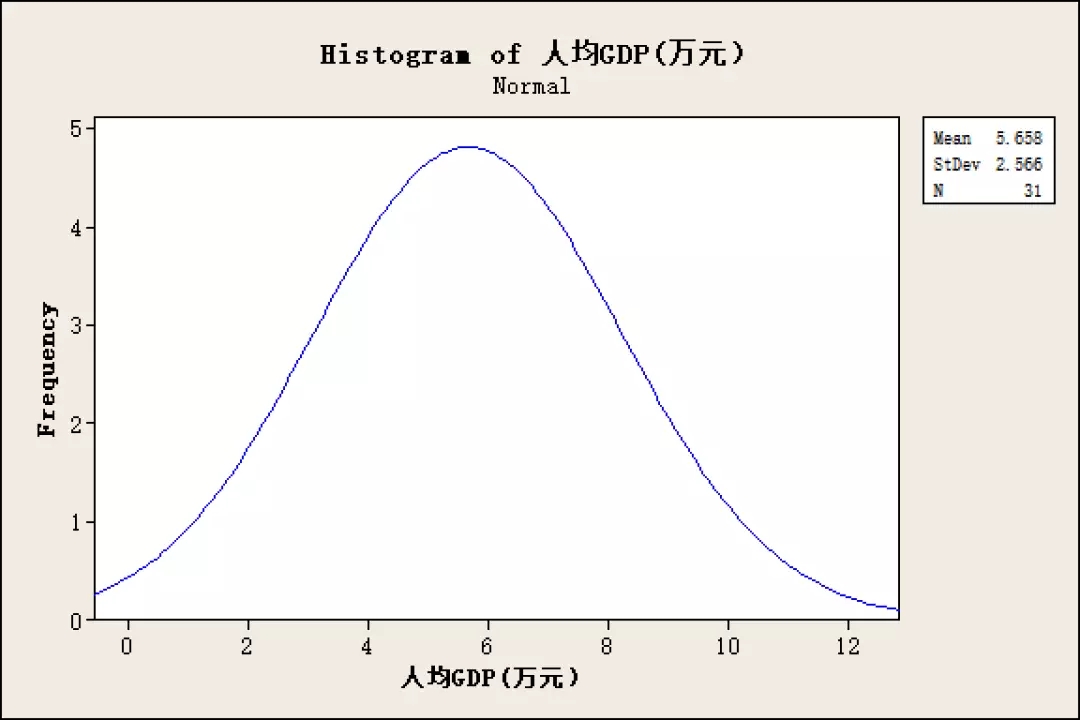通過(guò)對(duì)全國(guó)各大省市人均GDP直方圖及正態(tài)分布圖進(jìn)行分析,人均GDP的分布也服從正態(tài)分布,大部分省市的年人均GDP位于4-7萬(wàn)元區(qū)間,全國(guó)省市人均GDP均值為5.66萬(wàn)元。