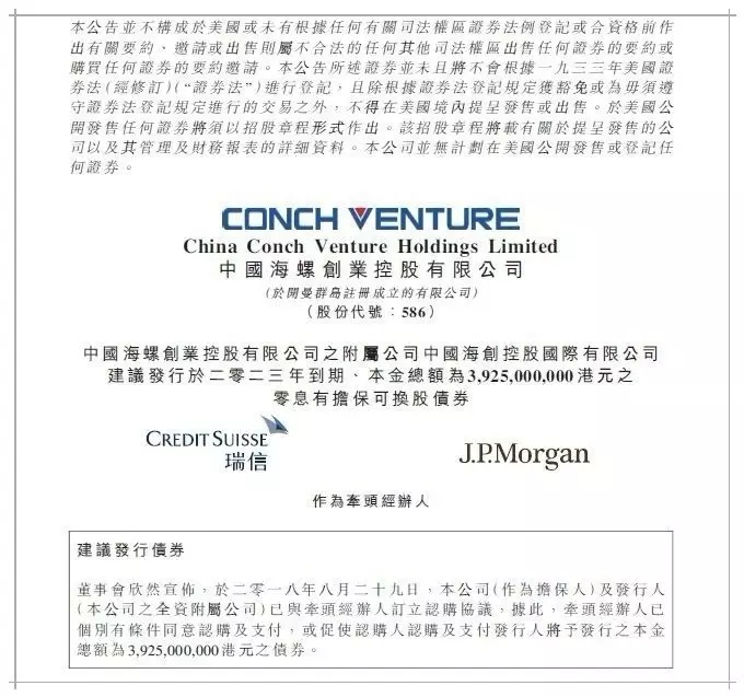 2018年8月30日凌晨,海螺創(chuàng)業(yè)抓住有利的市場機(jī)遇,選擇合適的發(fā)行窗口,成功發(fā)行了5年期39.25億港元零票息可轉(zhuǎn)換債券。