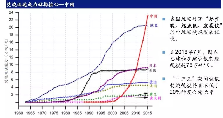 接著分別介紹了全球不同區(qū)域的垃圾處理狀況,分析了歐州、英國、美國、日本等國家的垃圾處理能力,總結(jié)了國際垃圾處理的發(fā)展形勢:英國垃圾焚燒成為歐洲最大的新興市場;日本不同類型焚燒設(shè)施總數(shù)減少但大廠增加,總處理量基本穩(wěn)定,發(fā)展相對成熟;美國近年來處于停滯狀態(tài);中國的垃圾處理發(fā)展正在進入全速發(fā)展階段。