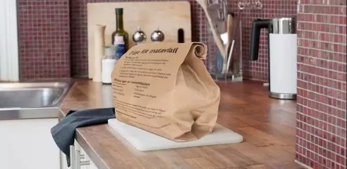 在瑞典,廚余垃圾有垃圾處理公司專門提供的棕色垃圾紙袋,裝滿后在開口處對折兩次,揭開自粘膠封條可以封起來,然后就可以扔在棕色的垃圾大桶里或者專用的廚余垃圾收集處。