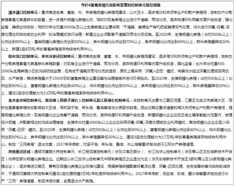 優(yōu)化畜禽及水產(chǎn)養(yǎng)殖布局。2017年前,依法關(guān)閉或搬遷禁養(yǎng)區(qū)內(nèi)的畜禽養(yǎng)殖場(小區(qū))和養(yǎng)殖專業(yè)戶,對四環(huán)線公路以外的未達標小型養(yǎng)殖小區(qū)按照規(guī)模標準實施改造升級,不再擴大限制發(fā)展區(qū)養(yǎng)殖規(guī)模,同時做好糞污資源化利用和處理。2018年底前,限制養(yǎng)殖區(qū)規(guī)模以下養(yǎng)殖場全部退出,規(guī)模以上畜禽養(yǎng)殖場(小區(qū))須實現(xiàn)糞污資源化利用,達到環(huán)保要求;未達到環(huán)保要求的,依法責令停止生產(chǎn)或者使用,并處以罰款。鼓勵適宜養(yǎng)殖區(qū)內(nèi)散養(yǎng)戶逐步退出,支持發(fā)展高標準、現(xiàn)代化的畜禽養(yǎng)殖場(小區(qū)),實現(xiàn)畜禽養(yǎng)殖退養(yǎng)平衡。逐步退出水產(chǎn)“三網(wǎng)”養(yǎng)殖。2017年1月底前,拆除梁子湖、湯遜湖、東湖、斧頭湖等重點湖泊的漁業(yè)“三網(wǎng)”設(shè)施;2017年12月底前,完成全市湖泊保護目錄中湖泊的漁業(yè)“三網(wǎng)”設(shè)施拆除。開展?jié)O業(yè)禁養(yǎng)區(qū)劃分,優(yōu)化水產(chǎn)養(yǎng)殖空間布局。中心城區(qū)40個湖泊列入漁業(yè)禁止養(yǎng)殖區(qū),不得開展經(jīng)營性水產(chǎn)養(yǎng)殖;其他126個湖泊由各轄區(qū)人民政府確定禁、限養(yǎng)殖分類,原則上列入漁業(yè)限制養(yǎng)殖區(qū),對列入限制養(yǎng)殖區(qū)的由各區(qū)人民政府依據(jù)湖泊水質(zhì)狀況制定養(yǎng)殖水域、面積、種類、密度等養(yǎng)殖規(guī)范,實行不投肥、不投藥、不投飼的生態(tài)養(yǎng)殖模式。到2020年,禁養(yǎng)區(qū)內(nèi)全部畜禽養(yǎng)殖及水產(chǎn)養(yǎng)殖企業(yè)退出;限養(yǎng)區(qū)內(nèi)規(guī)模以下畜禽養(yǎng)殖企業(yè)退出,完成水產(chǎn)禁、限養(yǎng)殖區(qū)域劃分,退出全部湖庫禁養(yǎng)區(qū)內(nèi)水產(chǎn)養(yǎng)殖,其他區(qū)域內(nèi)實施水產(chǎn)生態(tài)養(yǎng)殖改造。