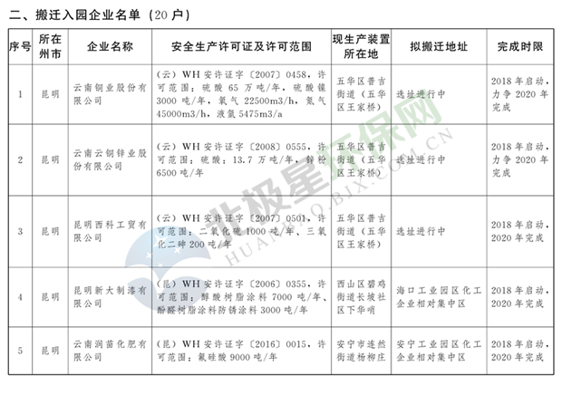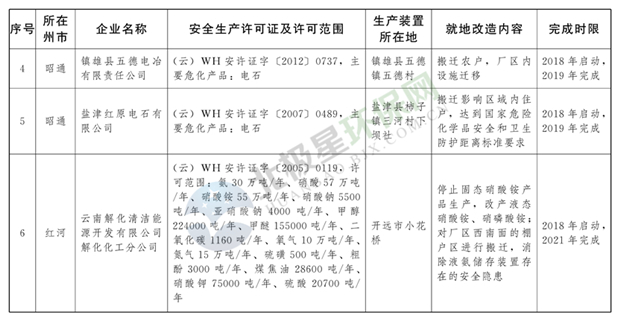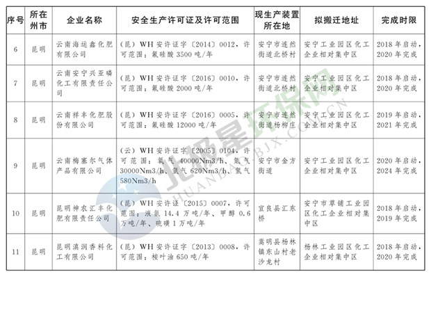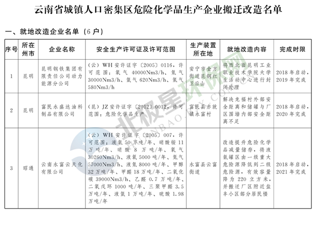日前云南省人民政府發(fā)布了《云南省城鎮(zhèn)人口密集區(qū)危險(xiǎn)化學(xué)品生產(chǎn)企業(yè)搬遷改造名單》,其中就地改造企業(yè)6戶,搬遷入園企業(yè)20戶,關(guān)閉退出企業(yè)16戶,具體名單見(jiàn)正文: