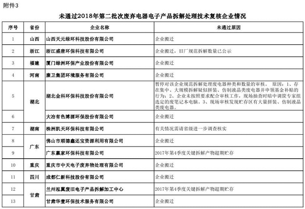 附件3:《未通過(guò)2018年第二批次廢棄電器電子產(chǎn)品拆解處理技術(shù)復(fù)核企業(yè)情況公示表》