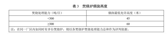 焚燒爐煙囪高度不得低于圖表中規(guī)定的高度,具體高度應(yīng)根據(jù)環(huán)境影響評價結(jié)論確定。如果在煙囪周圍200米半徑距離內(nèi)存在建筑物時,煙囪高度應(yīng)至少高出這一區(qū)域內(nèi)最高建筑物3m以上。