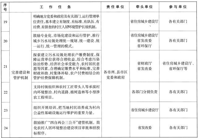 (七)持續(xù)完善建設和管護機制。明確地方黨委和政府及有關部門、運行管理單位責任,基本建立有制度、有標準、有隊伍、有經費、有督查的村莊人居環(huán)境管護長效機制。結合美麗鄉(xiāng)村建設、易地扶貧搬遷、農村危房改造、農村環(huán)境綜合整治和農業(yè)、林業(yè)、水利到村項目統(tǒng)籌實施農村人居環(huán)境整治。按照政府主導、分級負擔,集體補充、群眾參與,社會支持、多元籌集原則,合理確定政府、村集體和農戶出資責任,并承擔相應建設和管護職責。對污水垃圾集中處理、無害化衛(wèi)生公廁等農村衛(wèi)生公共服務設施的建設管護主要由政府出資;對戶用廁所改造、戶用小型污水處理等設施建設,由農戶適當出資、政府給予獎補,日常管護以農戶為主;村莊綠化、美化、亮化及道路硬化等建設,由村集體、農戶適當出資,村民投工投勞,政府給予獎補,日常管護以村集體為主。配備村莊保潔員,建立村莊日常保潔制度,建立運行監(jiān)督和激勵機制。各縣市區(qū)應將農村人居環(huán)境整治年度工作經費和設施建設運行費用納入財政預算管理。鼓勵專業(yè)化、市場化建設和運行管護,推行城鄉(xiāng)垃圾污水處理統(tǒng)一規(guī)劃、統(tǒng)一建設、統(tǒng)一運行、統(tǒng)一管理的模式。探索建立垃圾污水處理農戶付費制度,保障運營單位獲得合理收益,綜合考慮污染防治形勢、經濟社會承受能力、農村居民意愿等因素,合理確定繳費水平和標準,完善財政補助、村集體補貼、農戶付費相結合的管護經費保障機制。實施“農村建筑工匠培育工程”,開展建筑工匠培訓,探索建立建房建筑工匠驗收制度和公示制度。支持村級組織和農村工匠帶頭人等承接村內環(huán)境整治、村內道路、植樹造林等小型涉農工程項目。組織開展培訓,把當地村民培養(yǎng)成為村內公益性基礎設施運行維護的重要力量。鼓勵推廣“四自兩會三公開” (自選、自建、自管、自用,村委會、理事會,項目選擇公開、理事會選舉公開、工程建成后財務公開)建管機制。簡化農村人居環(huán)境整治建設項目審批和招投標程序,降低建設成本,確保工程質量。