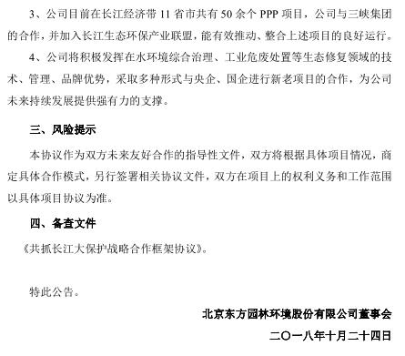 10月24日,東方園林公告,公司與長江三峽集團簽訂《共抓長江大保護戰(zhàn)略合作框架協(xié)議》,雙方將通過多種合作模式,推動長江經濟帶綠色產業(yè)經濟運營合作;目前東方園林在長江經濟帶11省市共有50余個PPP項目,與三峽集團合作,并加入長江生態(tài)環(huán)保產業(yè)聯盟,能有效推動這些項目的良好運行。