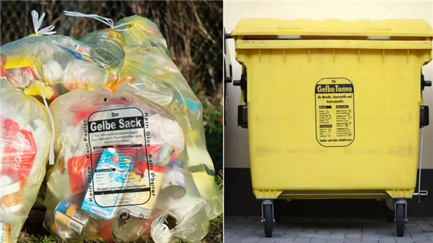 比如,黃桶(Gelbe Tonne)和黃袋(Gelber Sack)專門收集帶有綠點標志(Der Grüne Punkt)的輕型包裝。 其中包括,例如:空飲料罐、塑料包裝或者利樂磚飲料包裝(Tetrapacks)等。另外,也可以把塑料瓶裝入專門發(fā)放的、或購買的塑料袋子里,集中投放回收。這種黃袋可以到政府相關部門免費領取或從超市購買垃圾袋。