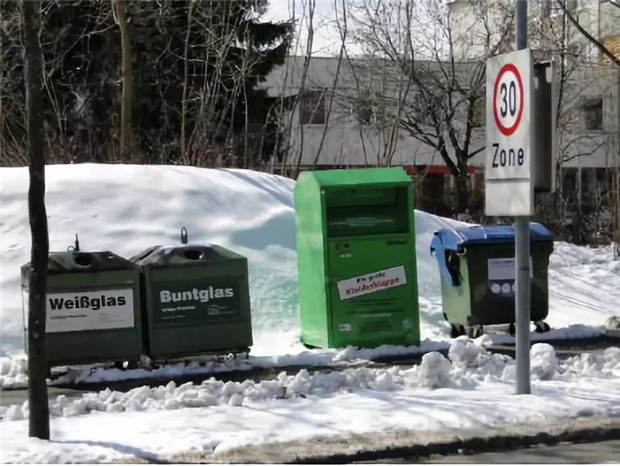 玻璃制品回收箱 :廢玻璃通過玻璃回收箱(Glascontainer)進行回收。同時有白色玻璃、雜色玻璃之分。有兩點事項需要注意:第一,請勿將帶有押金的包裝瓶(Pfandflaschen)丟入回收桶中;第二,玻璃瓶在丟棄前要去除瓶蓋,因為瓶蓋屬于黃桶廢棄物。
