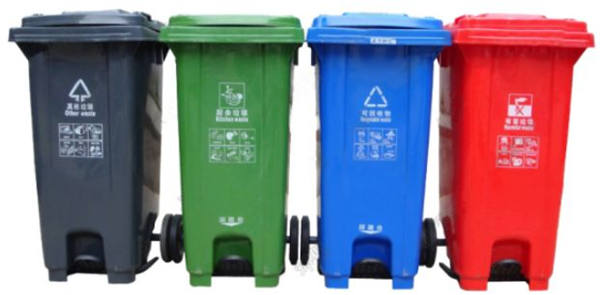 (其他垃圾:灰色,餐廚垃圾:綠色,可回收物:藍(lán)色,有害垃圾:紅色,鼓勵(lì)使用帶腳踏收集容器,方便市民投放)