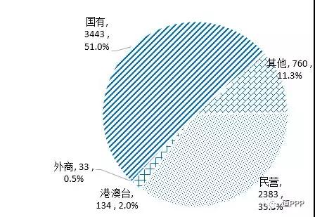 社會(huì)資本合作方類型。4,089個(gè)落地項(xiàng)目中社會(huì)資本所有制信息完善的項(xiàng)目共4,018個(gè),涉及社會(huì)資本共6,753家,包括民營(yíng)2,383家、港澳臺(tái)134家、外商33家、國(guó)有3,443家,另有類型不易辨別的其他760家,民營(yíng)企業(yè)占比35.3%,如圖1-6-1。
