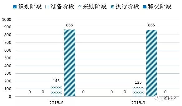三季度管理庫(kù)環(huán)比新增落地項(xiàng)目421個(gè)、投資額3,135億元,落地率環(huán)比上升2.0個(gè)百分點(diǎn)。管理庫(kù)累計(jì)落地項(xiàng)目總數(shù)4,089個(gè)、投資額6.3萬(wàn)億元,落地率49.3%,比年初上升11.1個(gè)百分點(diǎn),覆蓋除西藏以外的30個(gè)?。ㄗ灾螀^(qū)、直轄市)及新疆兵團(tuán)和19個(gè)領(lǐng)域。管理庫(kù)目前無移交階段項(xiàng)目。2018年二季度、三季度各階段項(xiàng)目數(shù)如圖1-5-1。