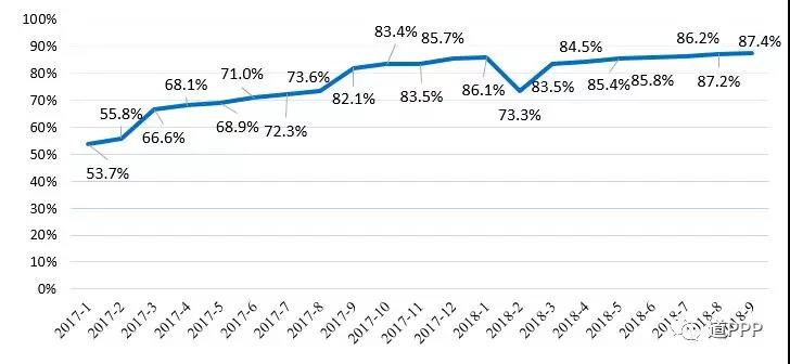 三季度落地示范項(xiàng)目?jī)魷p項(xiàng)目1個(gè)、投資額946億元,項(xiàng)目數(shù)、投資額下滑緣于落地示范項(xiàng)目退庫(kù)。截至2018年三季度,落地示范項(xiàng)目累計(jì)865個(gè)、投資額1.9萬(wàn)億元,落地率87.4%,無移交階段項(xiàng)目。示范項(xiàng)目總體落地率變化如圖2-2-1。