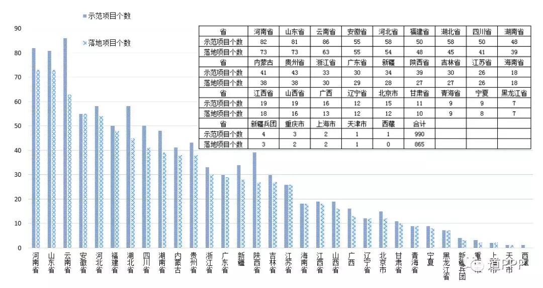 按各地落地示范項(xiàng)目數(shù)統(tǒng)計(jì),河南和山東(含青島)已有73個(gè)示范項(xiàng)目簽約進(jìn)入執(zhí)行階段,并列居全國(guó)第一;其后云南63個(gè)、安徽55個(gè)、河北54個(gè)。其余各省均不足50個(gè)。各地示范項(xiàng)目數(shù)與落地?cái)?shù)對(duì)比如圖2-4。