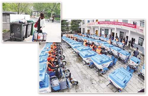 左上圖 居民的垃圾分類意識還有待提高。圖為北京市豐臺區(qū)某小區(qū)居民將沒有分類的垃圾投入分類垃圾箱。本報(bào)記者 熊 麗攝