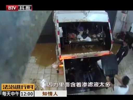 由于混裝,他們的第一道工序是將餐廚垃圾倒進(jìn)車?yán)?。?jīng)過擠壓。餐廚中的液體灑落一地,畫面略引起不適。