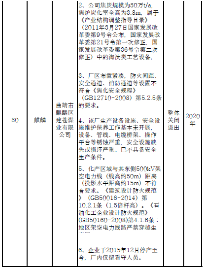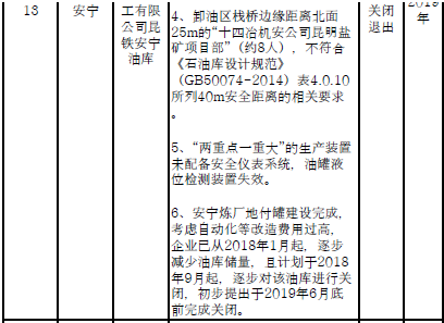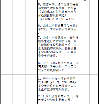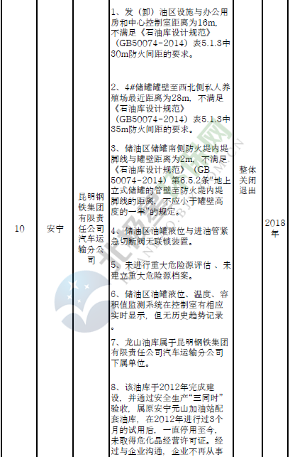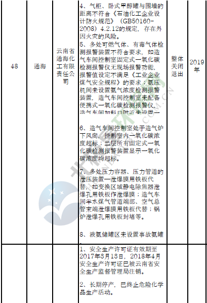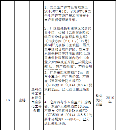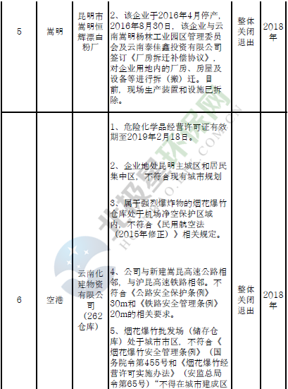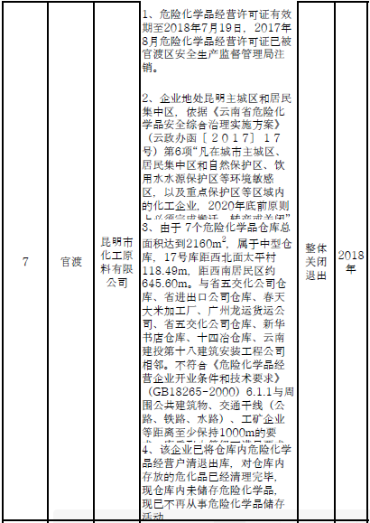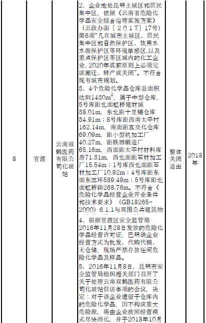 四、對(duì)8戶(詳見附件3)位于人員密集區(qū)、安全距離不足、工藝技術(shù)落后、存在重大隱患的危險(xiǎn)化學(xué)品生產(chǎn)(儲(chǔ)存)企業(yè)進(jìn)行綜合整治,2020年底前全部完成,各相關(guān)企業(yè)具體完成時(shí)間由各州市政府結(jié)合本地實(shí)際確定。各州市政府要統(tǒng)籌制定重大隱患綜合整治方案,做到“一企一方案”并報(bào)省安委會(huì)辦公室。其中:昆明市2戶,曲靖市1戶,玉溪市1戶,楚雄州1戶,文山州1戶,西雙版納州1戶,大理州1戶。