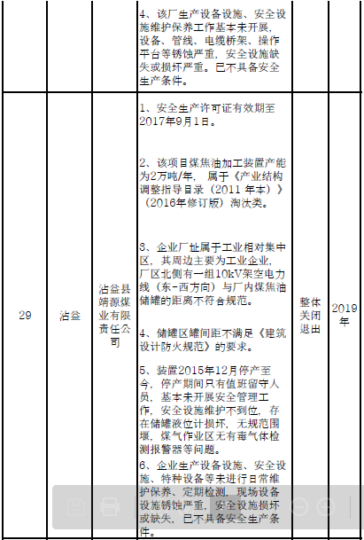 二、對(duì)91戶(詳見附件1)危險(xiǎn)化學(xué)品生產(chǎn)(儲(chǔ)存)企業(yè)和部分生產(chǎn)裝置,雖不在城鎮(zhèn)人口密集區(qū),但由于不符合產(chǎn)業(yè)政策、不具備基本安全生產(chǎn)條件且無法整改的,實(shí)施關(guān)閉退出。其中: