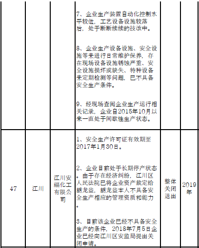 對(duì)91戶危險(xiǎn)化學(xué)品生產(chǎn)(儲(chǔ)存)企業(yè)和部分生產(chǎn)裝置,雖不在城鎮(zhèn)人口密集區(qū),但由于不符合產(chǎn)業(yè)政策、不具備基本安全生產(chǎn)條件且無法整改的,實(shí)施關(guān)閉退出。