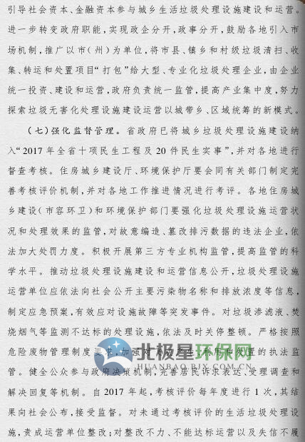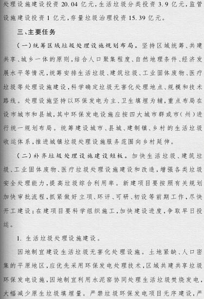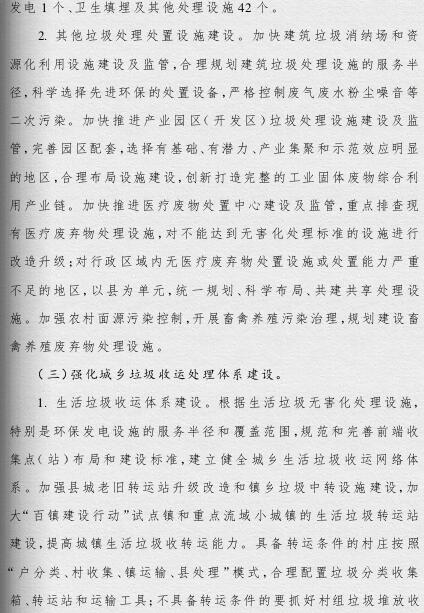 《方案》提出,要根據(jù)人口聚集程度、自然地理條件、經(jīng)濟發(fā)展水平等情況統(tǒng)籌規(guī)劃布局垃圾處理設(shè)施建設(shè);要補齊垃圾處理設(shè)施建設(shè)短板,到2019年底,新建生活垃圾無害化處理設(shè)施76座,完成無害化處理設(shè)施改擴建43個和存量垃圾治理項目62個。