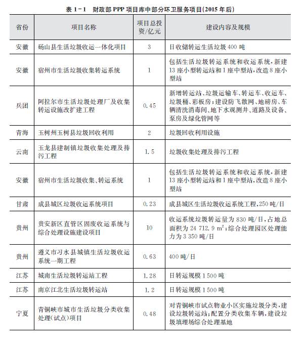 2015年開始,PPP模式在各地公用市政行業(yè)全面展開,業(yè)內(nèi)人士稱之為PPP元年。伴隨整個(gè)市場(chǎng)大環(huán)境,環(huán)衛(wèi)服務(wù)行業(yè)的市場(chǎng)化也已經(jīng)大幕開啟,越來越多的環(huán)衛(wèi)領(lǐng)域的項(xiàng)目開始公開招標(biāo)。各地開始出現(xiàn)一些分包作業(yè)或者環(huán)衛(wèi)一體化PPP項(xiàng)目,包含垃圾清運(yùn)、道路清掃、設(shè)施維護(hù)等環(huán)衛(wèi)作業(yè)內(nèi)容,或打包招標(biāo)。較為典型的是2015年??谑协h(huán)衛(wèi)一體化建設(shè)全面引入PPP模式項(xiàng)目,4個(gè)區(qū)分別由北京環(huán)衛(wèi)集團(tuán)、龍馬環(huán)衛(wèi)和深圳玉禾田公司中標(biāo)。2015年財(cái)政部建立的PPP項(xiàng)目庫(kù)中首次出現(xiàn)了17個(gè)環(huán)衛(wèi)項(xiàng)目,總規(guī)模約42億元,主要以垃圾清運(yùn)項(xiàng)目為主。截至目前通過2015年財(cái)政部建立的PPP項(xiàng)目庫(kù)檢索生活垃圾相關(guān)的PPP項(xiàng)目,有多達(dá)202條項(xiàng)目記錄,包含生活垃圾清運(yùn)、轉(zhuǎn)運(yùn)、分揀、終端處理設(shè)施新建和改擴(kuò)建等項(xiàng)目。