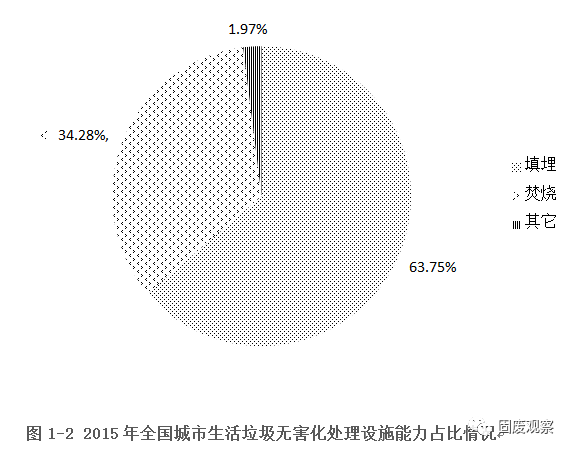 2015年全國(guó)城市生活垃圾無害化處理設(shè)施達(dá)到890座,無害化處理量為18013.01萬噸,比上一年分別增長(zhǎng)8.8%和9.88%。衛(wèi)生填埋、焚燒依舊是我國(guó)采用的垃圾無害化處理兩種主要方式。其中,衛(wèi)生填埋640座,比上一年增加36座,無害化年處理量為11483.14萬噸,比上一年增加6.88%。生活垃圾焚燒廠220座,比上一年增加32座,無害化年處理量為6175.52萬噸,比上一年大幅增加15.87%。其他類型處理設(shè)施30座,比上一年增添4座,無害化年處理量為354.35萬噸,比2014年增加10.88%。填埋、焚燒分別占總無害化處理量的63.74%、34.28%,“十二五”期間,填埋處理總量比例持續(xù)小幅下降,焚燒廠數(shù)量和處理能力持續(xù)保持明顯上升,其他類型處理方式一直未有突破性發(fā)展。
