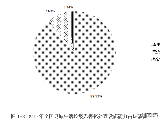 2015全國(guó)縣城生活垃圾無害化處理設(shè)施共有1187座,無害化處理量為5259.94萬噸,比2014年分別增長(zhǎng)5.14%和10.35%。目前,衛(wèi)生填埋無論從設(shè)施數(shù)量和處理能力依舊是我國(guó)縣城垃圾無害化處理最主要方式。2015年衛(wèi)生填埋場(chǎng)1108座,比上一年新增53座;填埋無害化處理能力157615噸/日,年無害化處理量為4688.26萬噸,占縣城生活垃圾無害化處理總能力的89.13%,與去年89.41%基本持平。2015,全國(guó)縣城焚燒廠37座,較去年增長(zhǎng)了3座;無害化處理總量401.43萬噸,較2014年的344.1萬噸,增長(zhǎng)了16.66%,但占縣城生活垃圾無害化處理總能力比例只稍微提升了0.41%。其他無害化處理設(shè)施,2015年縣城共有42座,較2014年的40座,只增長(zhǎng)了2座,總的處理量與2014年相比也只增長(zhǎng)了9.42萬噸??h城生活垃圾的處理設(shè)施和能力未發(fā)生明顯變化。