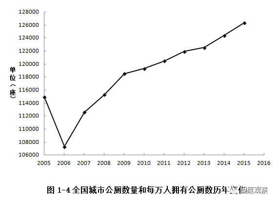 2015年全國(guó)縣城公共廁所數(shù)量為43480座,其中三類以上廁所21369座,較2014年,分別增加231座和931座;三類以上公共廁所占全部公共廁所比例由2014年的47.36%繼續(xù)攀升至49.15%。