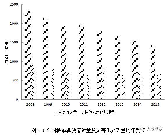 2015年全國(guó)城市共清運(yùn)糞便1436.77萬噸,無害化處理量673.67萬噸,無害化處理率為46.89%。清運(yùn)量較2014年繼續(xù)保持下降,但無害化處理率繼續(xù)保持上升,較上一年增加2.30%。