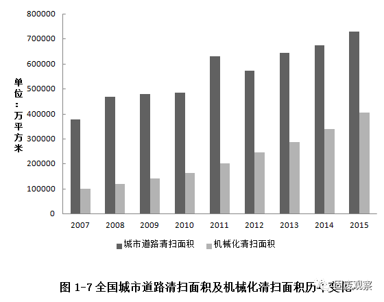 2015年全國(guó)城市道路清掃面積730333萬平方米,其中機(jī)械化清掃面積405569萬平方米,占全部清掃面積55.53%。全國(guó)城市道路清掃面積累計(jì)比2014年增加8%,機(jī)械化清掃面積比2014年增長(zhǎng)18.9%,道路機(jī)械清掃作業(yè)率繼續(xù)顯著提高。