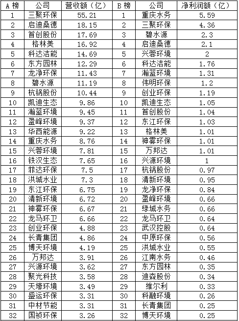 2017年多數(shù)環(huán)保上市企業(yè)一季度報(bào)告顯示贏得開門紅,同期均有所增長,僅四家表示營業(yè)收入同期下降。不過凈利潤7家為虧損狀態(tài), 15家同期下降。以下A榜為營業(yè)收入排行榜,B榜為凈利潤排行榜。C榜為營業(yè)收入同比增長率排行榜,D榜為凈利潤同比增長率排行榜。