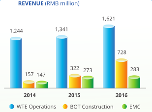 截止2016年12月底,公司已在中國的12個省、自治區(qū)額直轄市已運行了19家垃圾焚燒發(fā)電廠,運營日處理垃圾能力總計27430噸,裝機容量達469MW。2016年垃圾處理量增加17.4%達到813噸,實現了2016年稅前利潤和稅后利潤分別達到29.0%和32.3%的高增長,2016年實現歸屬股東的凈利潤為5.98億元,同比增長34.7%。
