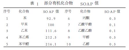 揮發(fā)性有機化合物(VolatileOrganicCompounds,簡稱VOCs)一般指沸點低于250℃的化學物質,是最為常見的大氣污染物,其主要來源于化工、制藥、石油、皮革、噴涂等行業(yè)排放的有機溶劑廢氣,包含脂肪烴、鹵代烴、硫烴、芳香烴、有機酸等。這些有機廢氣不但對環(huán)境質量、人體健康、動植物生產(chǎn)等造成極大的直接危害,且在光氧化反應下,易形成二次有機物氣溶膠(SecondaryOrganicAerosol,簡稱SOA),導致光化學煙霧、酸雨、霾和氣候變化等一系列環(huán)境問題的產(chǎn)生,這些揮發(fā)性有機廢氣在空氣中懸浮匯聚亦是導致PM2.5和PM10數(shù)值不斷上升的原因之一,因而如何削減這些揮發(fā)性污染物至關重要。Derwent等[1]一直致力于二次SOA的研究,他們通過二次有機氣溶膠生成潛勢(Seconda-ryOrganicAerosolPotential,簡稱SOAP)研究,對多達上百種揮發(fā)性有機化合物進行SOAP計算,具體見表1。