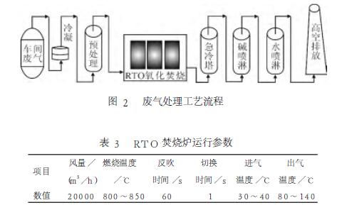 本文研究的RTO氧化焚燒裝置處理風量設計為20000m3/h,處理工藝流程如圖2所示。廢氣經(jīng)過車間二級冷凝回收部分有機溶劑,再進入預處理堿噴淋,吸收無機廢氣和水溶性廢氣,進入RTO進行氧化焚燒,先進入急冷塔冷卻,最終通過堿、水處理后于15m高空排放。RTO焚燒爐運行參數(shù)見表3