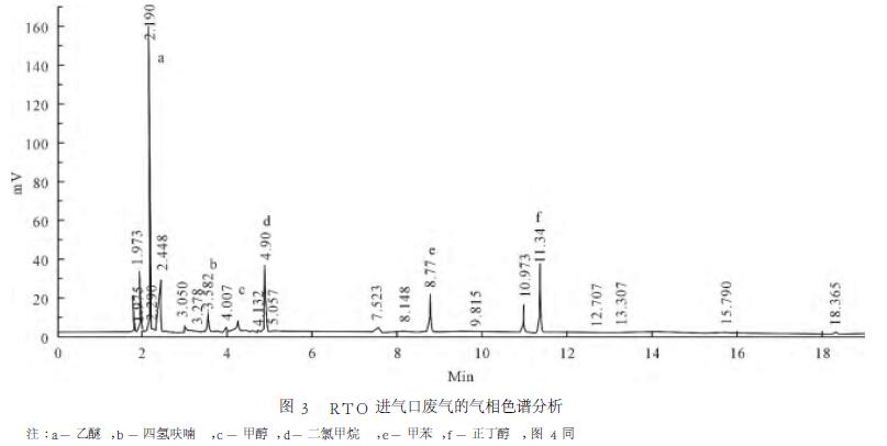 以正丁醇作內標物,檢測廢氣中乙醚、四氫呋喃、甲醇、二氯甲烷、甲苯共5種組分含量,通過標準樣品分析,確定各個組分停留時間,結果見圖3和圖4。由圖可見,對各組分出峰面積進行校正,甲醇進氣濃度188mg/m3,經(jīng)RTO氧化焚燒后,甲醇出氣濃度降至9.8mg/m3,削減率94.8%;四氫呋喃進氣濃度121.9mg/m3,經(jīng)氧化焚燒后,出氣濃度降至6.6mg/m3,削減率94.6%;二氯甲烷進氣濃度2079mg/m3,經(jīng)氧化焚燒后,出氣濃度降至97mg/m3,削減率95.3%;同樣,甲苯和乙醚削減率分別達88.0%和96.8%,且排放濃度滿足《大氣污染物綜合排放標準》(GB16297-2012)。