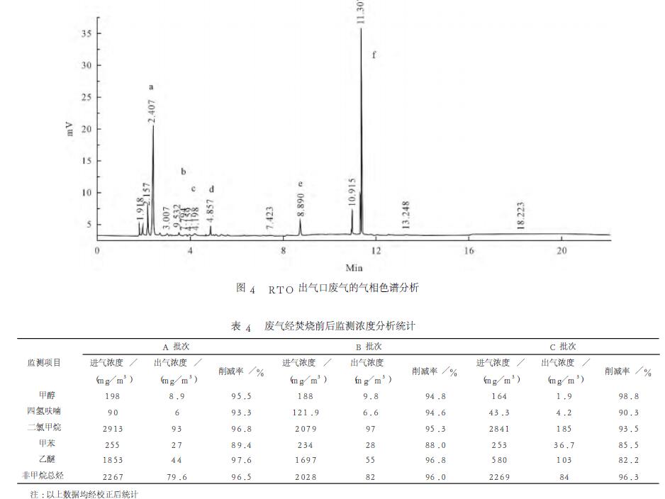 為檢測RTO氧化焚燒對非甲烷總烴削減效率,本文采用氣相色譜儀以火焰離子化檢測器分別測定空氣中總烴及甲烷烴的含量,得出非甲烷烴含量。檢測結果見表4,非甲烷總烴削減率達96%~96.5%。