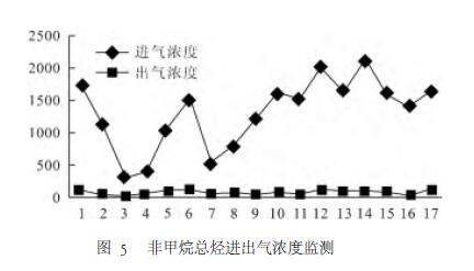 為考察RTO運行性能穩(wěn)定性,運行持續(xù)對該設備跟蹤研究半個多月,并將RTO進出口非甲烷總烴監(jiān)測濃度進行匯總,研究發(fā)現(xiàn)RTO對總有機廢氣的削減效率達95%以上,具體見圖5。