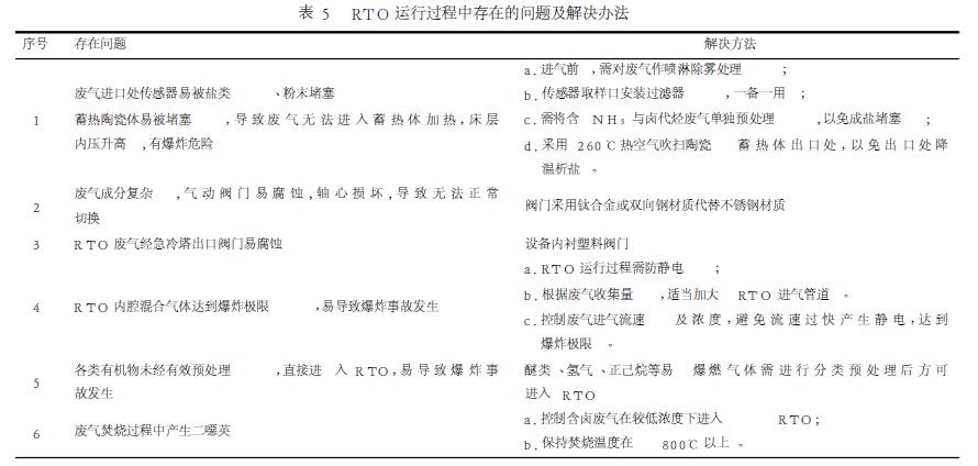 從首臺RTO投入運行至今,已近40多個年頭。自20世紀90年代后RTO得到了長足發(fā)展,幾乎取代了經(jīng)典的熱力焚燒裝置,并且在絕大部分有機廢氣凈化技術領域內占據(jù)著主導地位。不過,由于大部分有機廢氣存在著組分復雜,濃度高,包含各種有機、無機物質等問題,因此,在RTO實際運行維護中出現(xiàn)較多未曾預料到的問題。本文對本地區(qū)范圍內醫(yī)藥化工行業(yè)RTO多年運行所存現(xiàn)狀問題及解決方法進行歸納,匯總如表5。