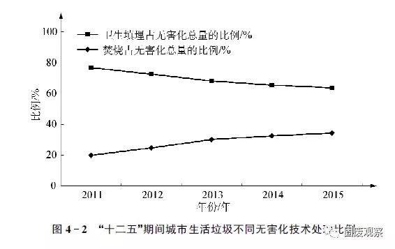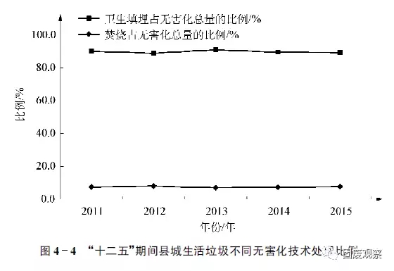 由表4-2可知,2015年我國(guó)東部地區(qū)填埋比例是81.8%,中部和西部地區(qū)填埋比例更高,分別是93.8%和92.6%,表明填埋仍然在縣城區(qū)域垃圾處理中占據(jù)著絕對(duì)主力位置。