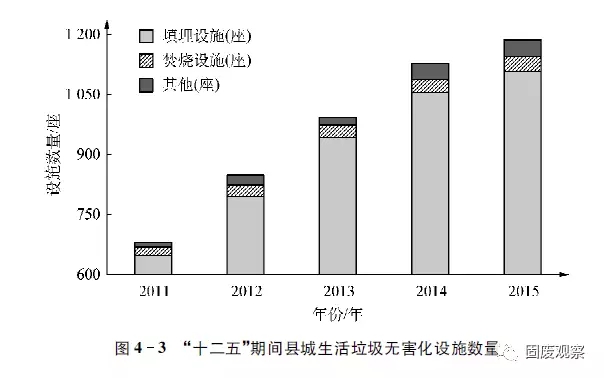 2015年全國(guó)縣級(jí)行政區(qū)域的無(wú)害化處理廠1187座,其中填埋設(shè)施1108座,比2014年新增53座,占全部縣級(jí)無(wú)害化處理設(shè)施的93.3%,從圖4-3可知,“十二五”期間縣城生活垃圾無(wú)害化處理設(shè)施建設(shè)得到快速發(fā)展。