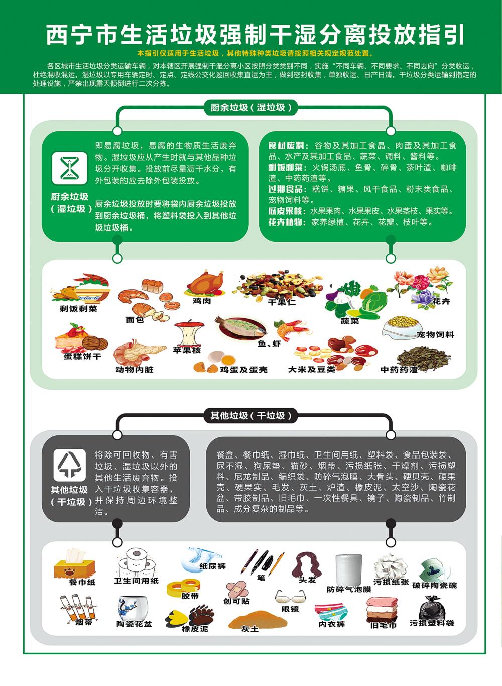 西寧市生活垃圾強制干濕分離投放指引圖。西寧市生活垃圾分類推進辦公室供圖自1月7日起,西寧市全力開展生活垃圾“強制干濕分離”試點工作。12個試點小區(qū)、6605戶家庭正式進行生活垃圾“強制干濕分離”。近日,記者分別探訪了幾處試點小區(qū),深入了解西寧市生活垃圾“強制干濕分離”試點工作。垃圾分類彰顯綠色發(fā)展理...