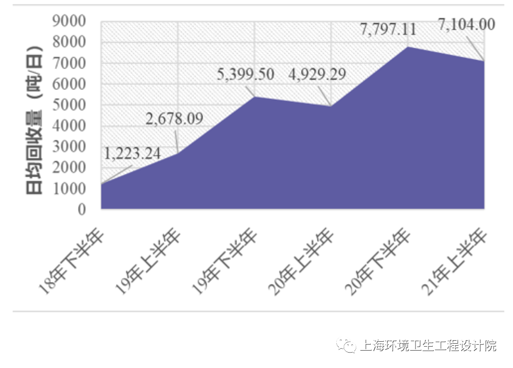 一、上海可回收物產(chǎn)量有多少?(一)可回收物總體統(tǒng)計(jì)情況2021年,上海市可回收物信息化平臺(tái)統(tǒng)計(jì)到主體企業(yè)上報(bào)可回收物量約5000噸/日,另外據(jù)相關(guān)部門(mén)估算的再生資源回收體系中約有2000噸/日為生活源可回收物,可回收物產(chǎn)量總計(jì)約7000噸/日。2018-2021年上海可回收物產(chǎn)量(二)居民家庭可回收...