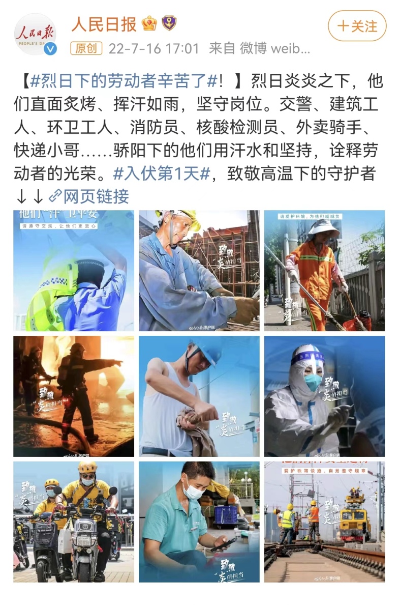 人民日?qǐng)?bào)7月16日消息,烈日炎炎之下,他們直面炙烤、揮汗如雨,堅(jiān)守崗位。交警、建筑工人、環(huán)衛(wèi)工人、消防員、核酸檢測(cè)員、外賣(mài)騎手、快遞小哥……驕陽(yáng)下的他們用汗水和堅(jiān)持,詮釋勞動(dòng)者的光榮。來(lái)源 | 人民日?qǐng)?bào)編輯 | 匡宋堯