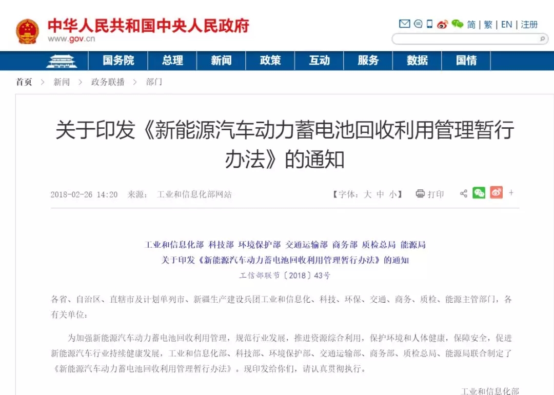 2月26日,工業(yè)和信息化部、科技部、環(huán)境保護(hù)部、交通運(yùn)輸部、商務(wù)部、質(zhì)檢總局、能源局印發(fā)《新能源汽車動力蓄電池回收利用管理暫行辦法》的通知,旨在加強(qiáng)新能源汽車動力蓄電池回收利用管理,規(guī)范行業(yè)發(fā)展。來源:工信部官網(wǎng)通知提出,汽車生產(chǎn)企業(yè)應(yīng)建立動力蓄電池回收渠道,負(fù)責(zé)回收新能源汽車使用及報(bào)廢后產(chǎn)生的廢舊...